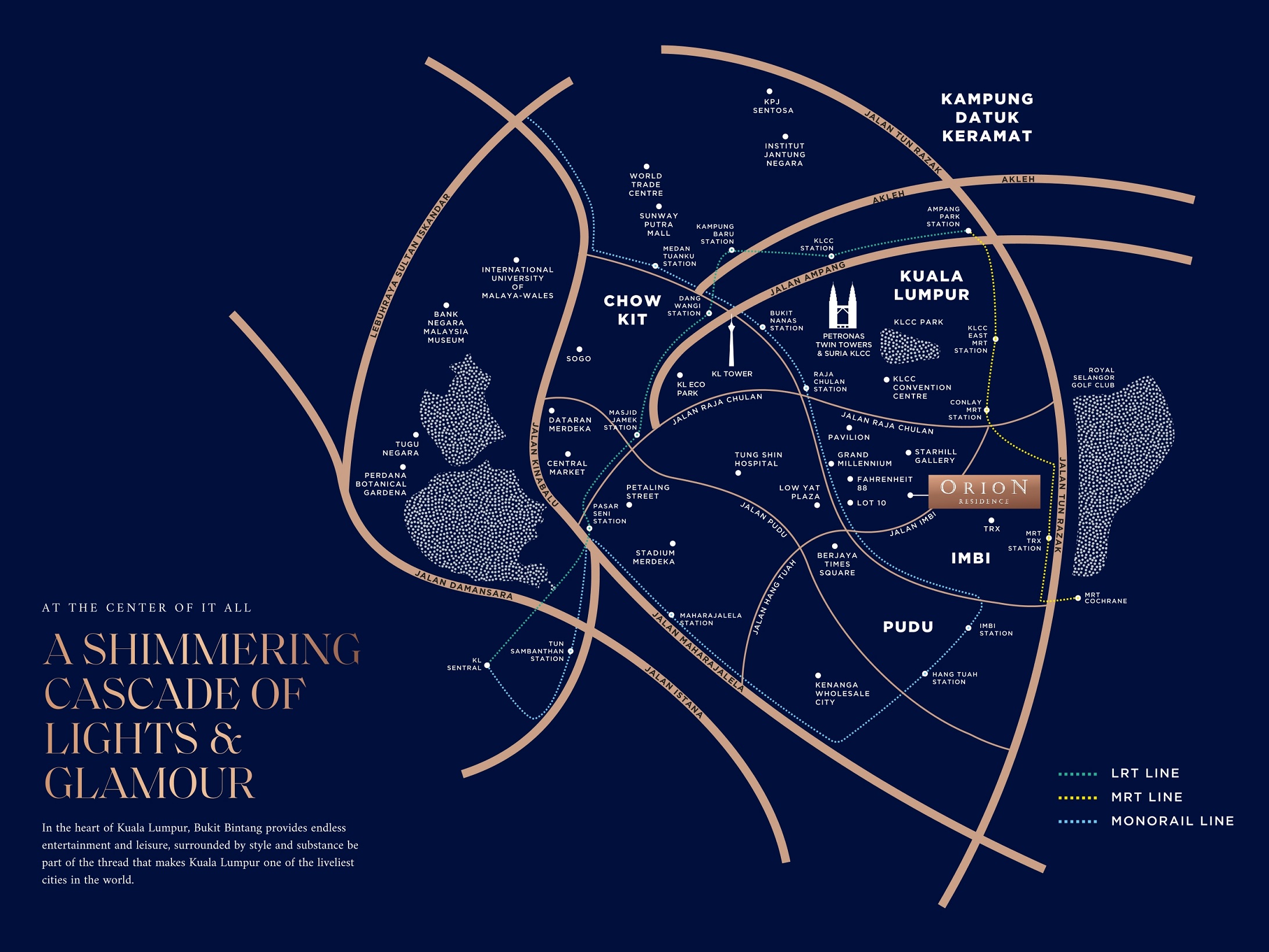 Orion Residence finds its place in the heart of Bukit Bintang, a bustling city haven that offers unparalleled access to the area’s premier malls and the TRX financial district. Its location promises a lifestyle of convenience and exclusivity, embodying the essence of city living with accessibility like no other.